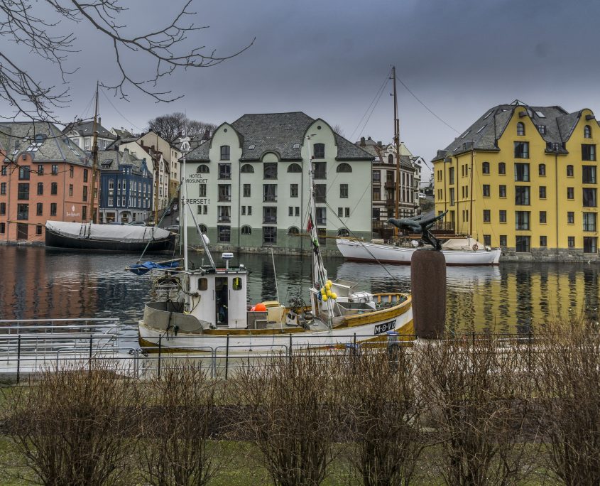 Die Stadt liegt malerisch auf mehreren Inseln. Von hier aus kann man zur Vogelinsel Runde oder in Richtung Geirangerfjord, der im Winter nicht angefahren wird, starten.